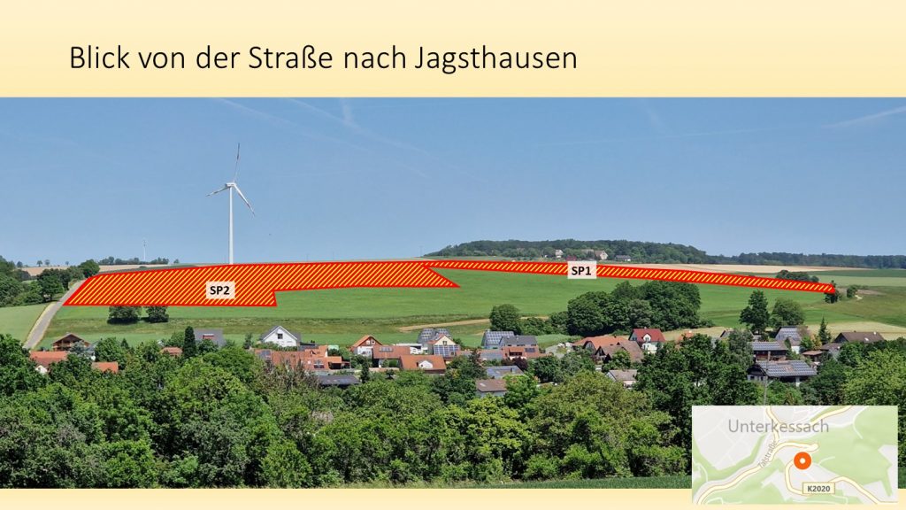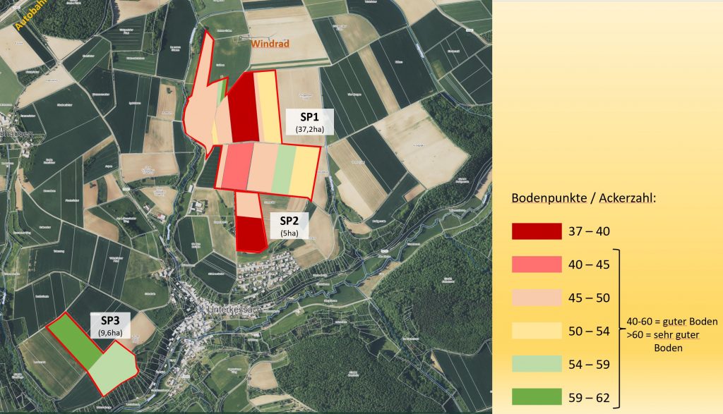 SP1 ist eigentlich der bislang letzte Solarpark, der in den Gemeinderat eingebracht wurde und müsste eigentlich anders nummeriert sein. Ursprünglich mal eine Idee Unterkessacher Bürger hat er sich inzwischen zu einer 37ha großen Solarfabrik entwickelt: