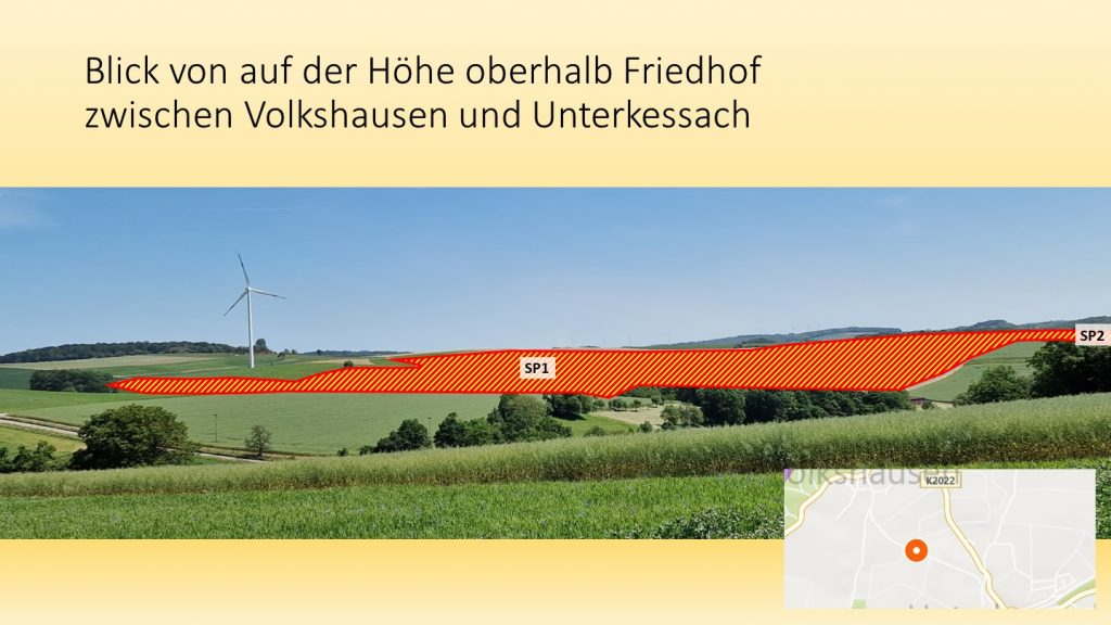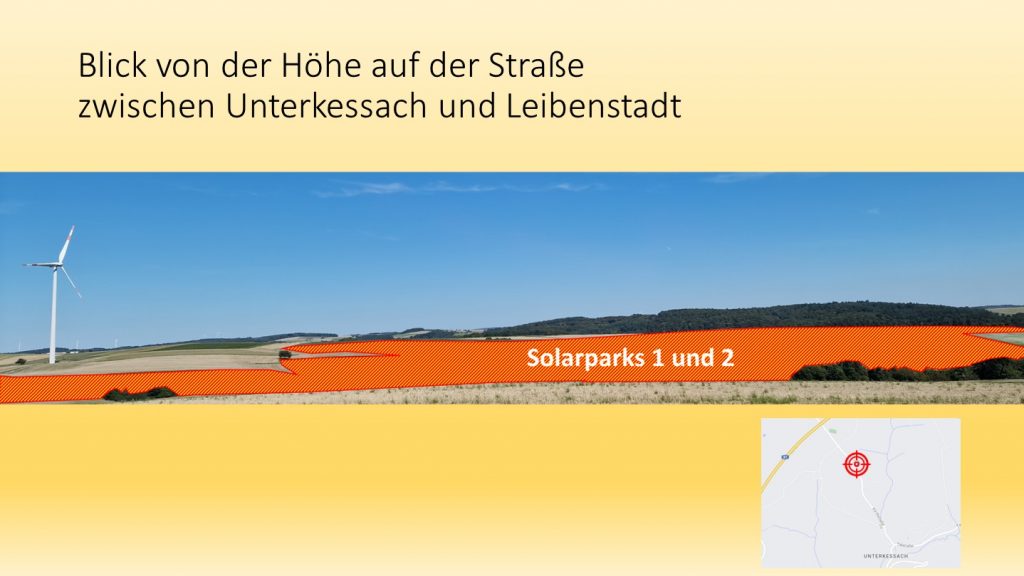 Derzeit werden auf Unterkessacher Gemarkung drei Solarparks mit einer Gesamtfläche von 52ha geplant. Das entspricht einer Fläche von ca. 73 Fußballfeldern oder ungefähr dem Doppelten der gesamten bewohnten Fläche von Unterkessach und Volkshausen. Angeblich sollen ein vierter ubd fünfter Solarpark mit weiteren zusätzllichen 11ha bzw. 22ha bei Volkshausen entstehen, genauer Standort noch unklar.