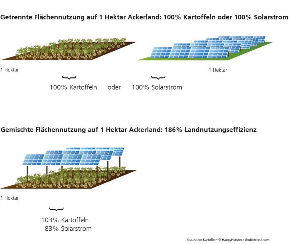 Im Internet bin ich auf die Alternative Agri-Photovoltaik gestossen, die seit nun schon fast 10 Jahren zunehmend an Bedeutung gewinnt. Es gibt zahlreiche Forschungsanlagen und inzwischen auch schon gesicherte Erkenntnisse über den Nutzen der Kombination aus Landwirtschaft und Photovoltaik.