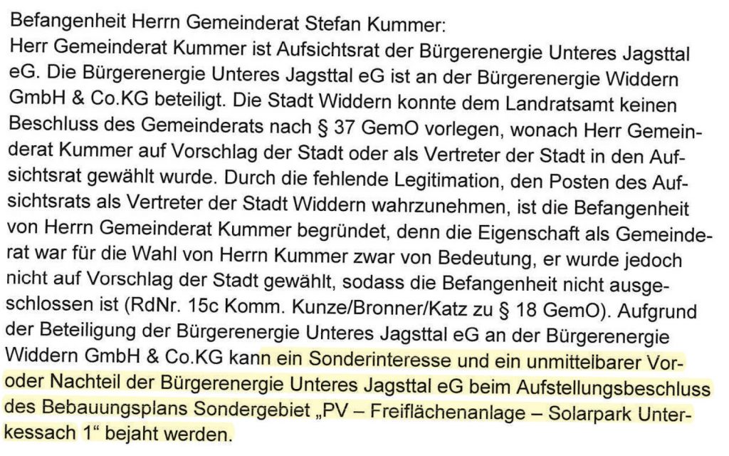 Die Skeptiker der Solarpark-Pläne für Unterkessach haben einen klaren Zwischensieg errungen: Gemeinderat Stefan Kummer war und ist als Aufsichtsrat der Bürgerenergie Unteres Jagsttal eG bei den Beschlussfassungen zu SP1 befangen.